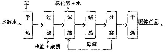 工藝說明:水解水首先予熱至沸騰。然后,將予熱后溶液過濾(采用真空過濾)除去溶液中殘油及其它雜質(zhì)。過濾后溶液濃縮至溶液表面有晶膜出現(xiàn)便停止加熱(濃縮終點溫度為124℃,粗測),使共自然結晶。將結晶體與母液分離(離心分離或真空抽濾),母液送回再次濃縮,固體包裝后即為結晶三氯化鋁產(chǎn)品?;?qū)饪s結晶后的固體產(chǎn)品經(jīng)與液液分離后,通入熱風進行干燥處理,包裝后即為產(chǎn)品。