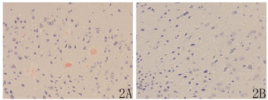 剛果紅染色, AD模型組海馬CA2區(qū)細胞外可見多個Aβ斑, 染成淡紅色, 在其周圍可能有浸潤的膠質(zhì)細胞及變性神經(jīng)細胞染成藍色, 背景清晰 (圖2A) ;而正常組錐體細胞結(jié)構(gòu)清晰, 未見Aβ斑 (圖2B) 。